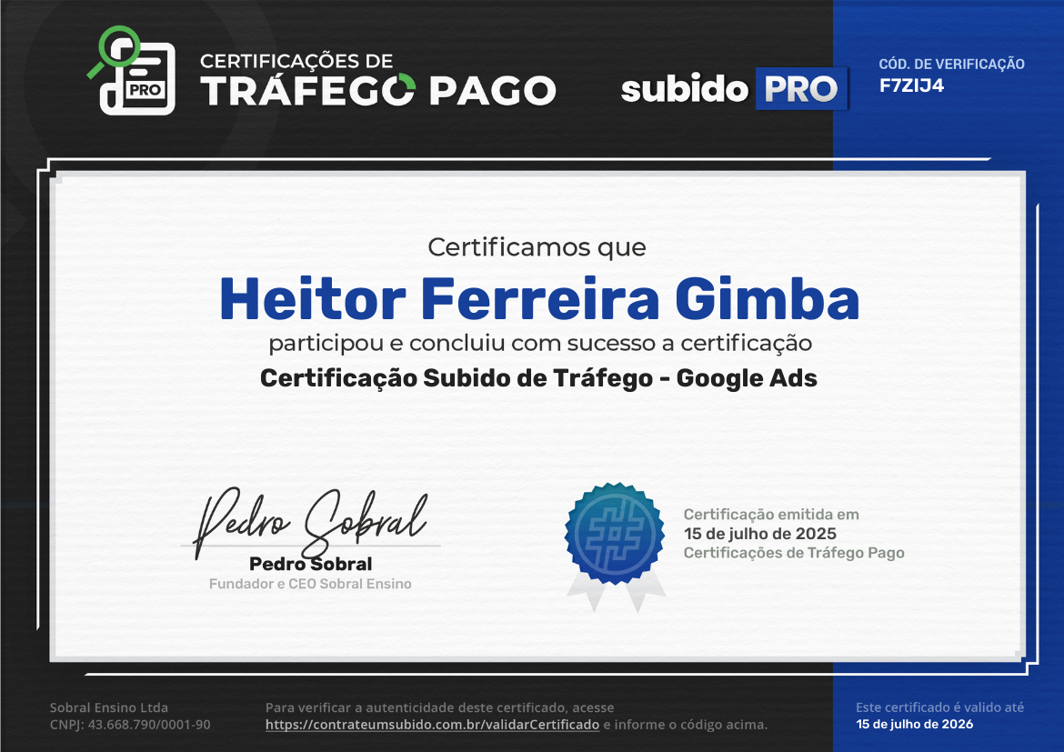 Meu nome é Heitor Gimba e sou apaixonado pelo mundo do marketing digital há mais de 2 anos. Durante esse tempo, tenho me dedicado intensamente à Gestão de Tráfego Pago, trabalhando com uma ampla variedade de nichos, produtos e serviços.